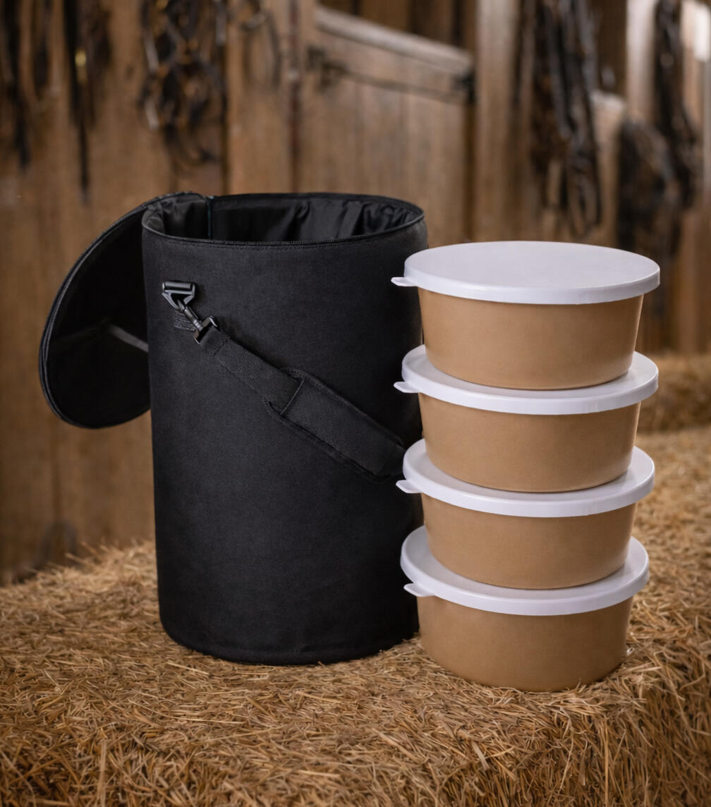 Torba bez problemu mieści 4 okrągłe pojemniki paszowe.